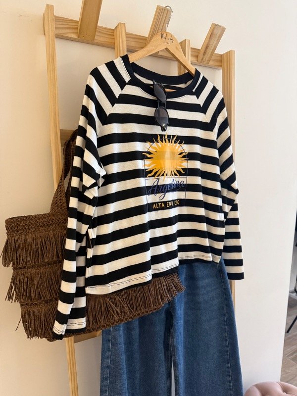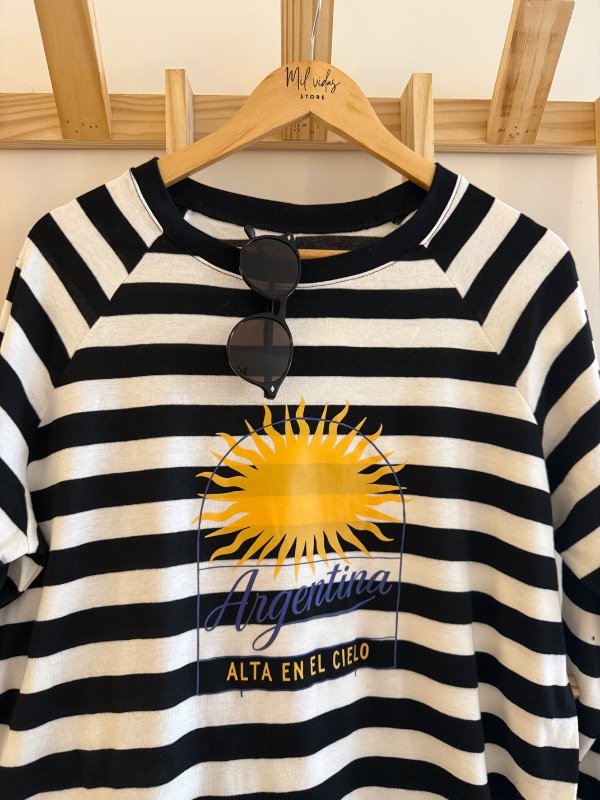 Remera de manga larga en algodón suave, con estampa central inspirada en el sol argentino y la leyenda “Argentina – Alta en el Cielo”. Su diseño a rayas negras y blanco le aporta un estilo clásico y versátil, ideal para looks urbanos con un toque canchero.