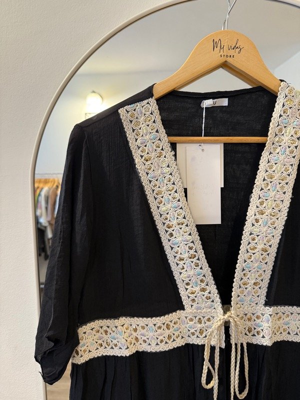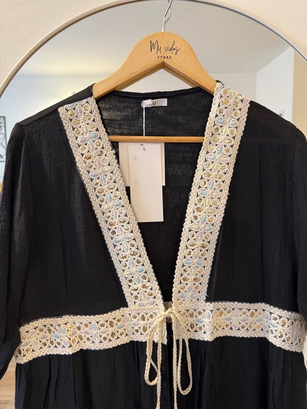 Su diseño está realzado con bordados artesanales y apliques espejados en el frente y la cintura, que aportan brillo sutil y un acabado súper femenino. El lazo con terminación de borlas permite llevarlo abierto o cerrado según el estilo que quieras crear.