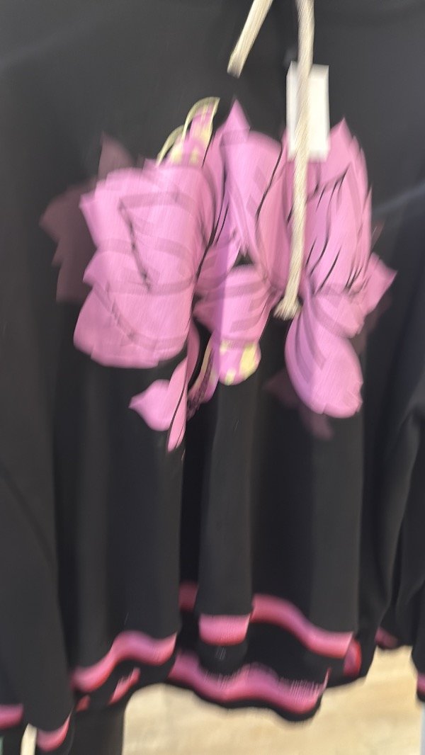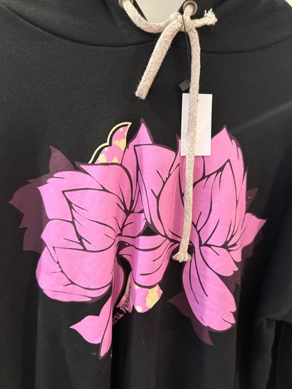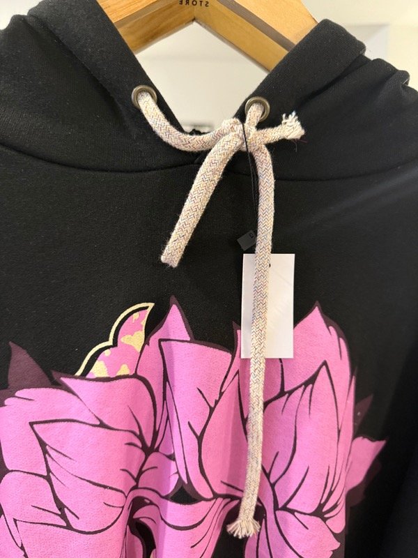 Buzo de tela rústica con detalles de brillitos en los cordones y con una estampa súper original y única en tonos fucsia.