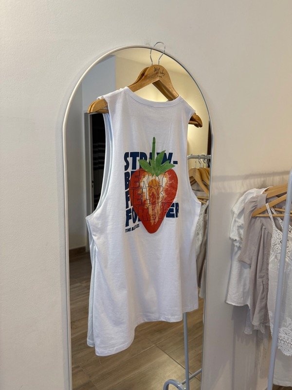 En la espalda tiene una estampa protagonista con frutilla y tipografía en tonos rojo, verde y azul que le aporta un toque canchero y original. También estampa delantera.