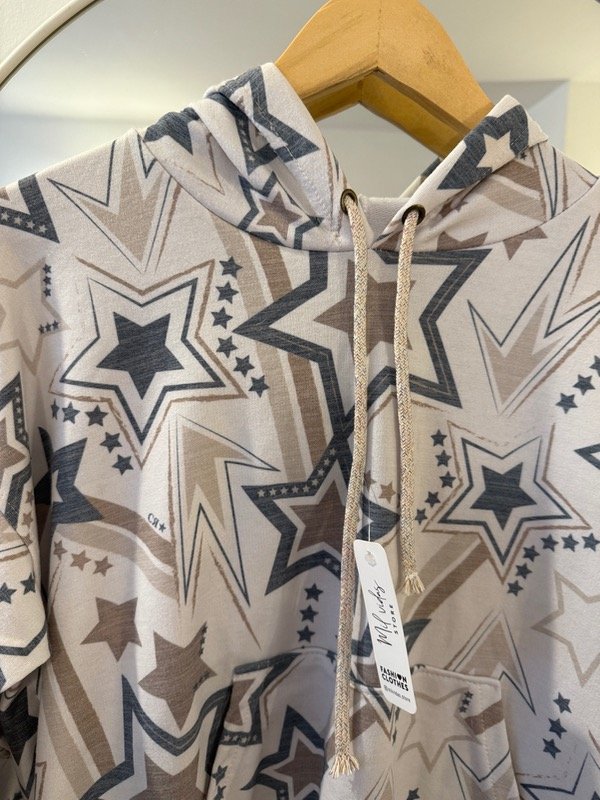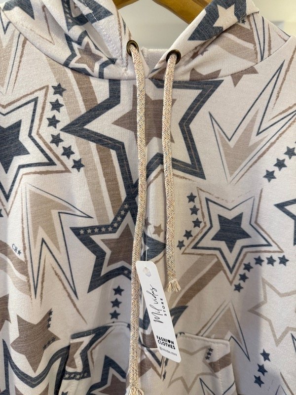 Buzo rústico en tono natural con estampa de estrellas en beige y azul, un mix sutil que suma luz y personalidad.