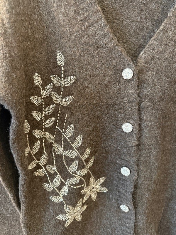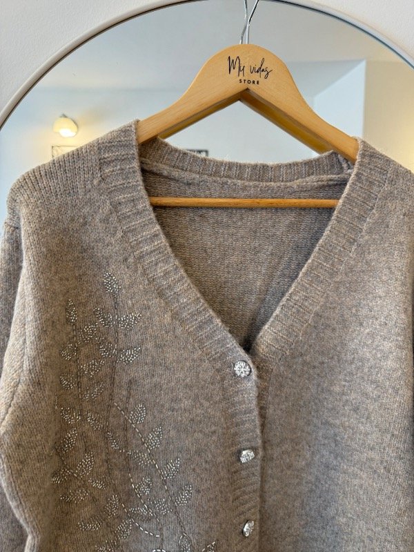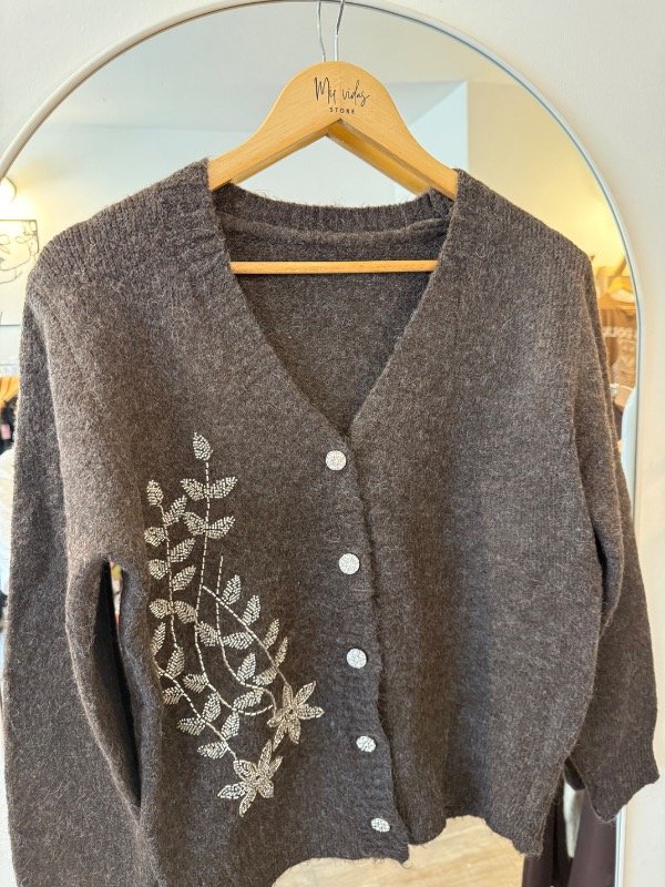 Cárdigan tejido de textura suave y abrigada, con escote en V y calce relajado. Presenta botones al frente con strass y un delicado bordado floral en uno de los laterales que suma un detalle sutil y especial. Su largo es ideal para usar tanto cerrado como abierto, adaptándose a distintos looks.