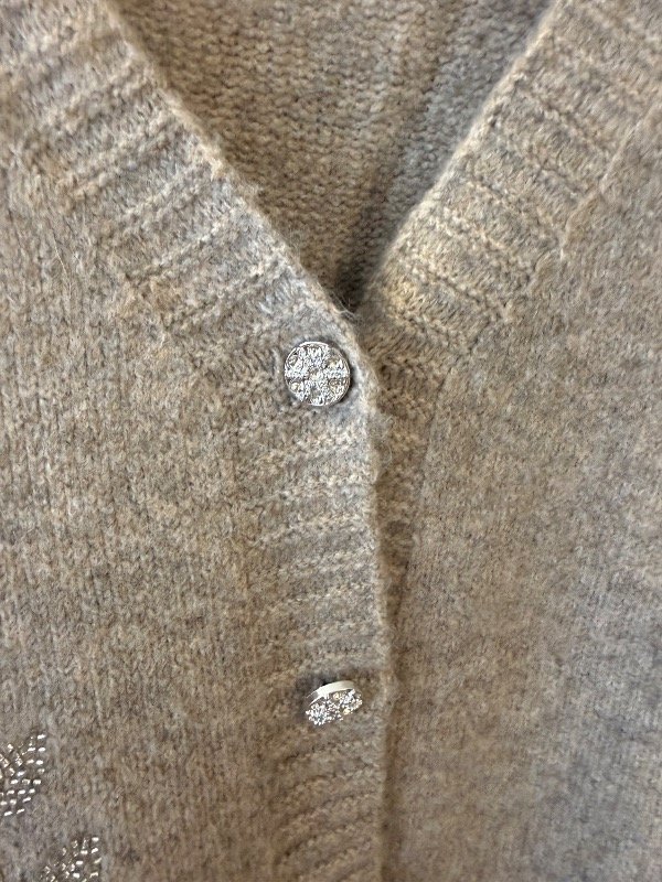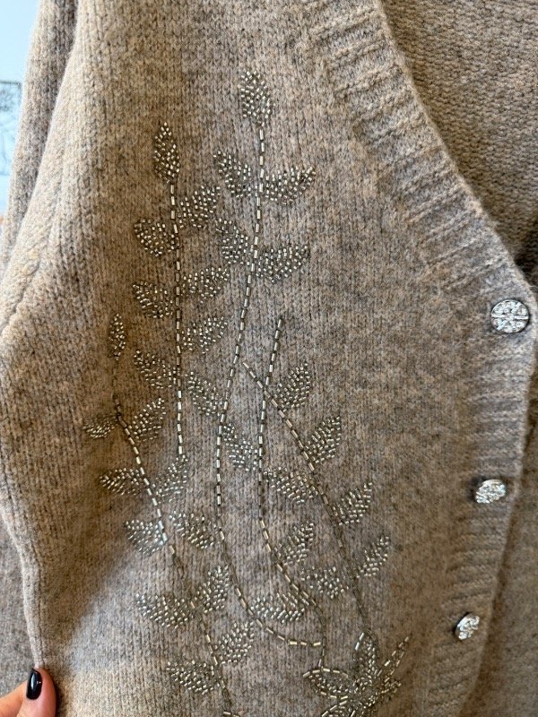 Cárdigan tejido de textura suave y abrigada, con escote en V y calce relajado. Presenta botones al frente con strass y un delicado bordado floral en uno de los laterales que suma un detalle sutil y especial. Su largo es ideal para usar tanto cerrado como abierto, adaptándose a distintos looks.