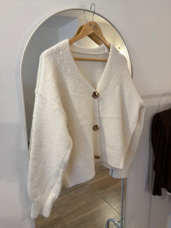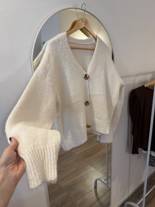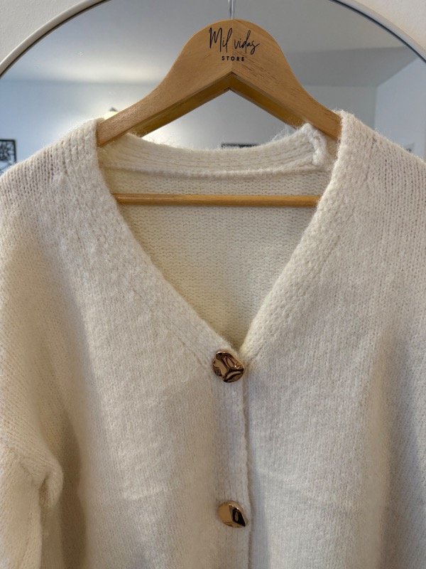 Saco largo tejido en lana en crema de textura suave, con escote en V que estiliza la silueta. Presenta botones dorados al frente que aportan un detalle elegante y distintivo. Una prenda cómoda y abrigada, ideal para sumar calidez y presencia a cualquier look.