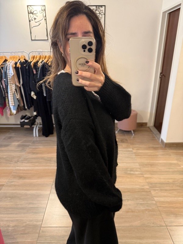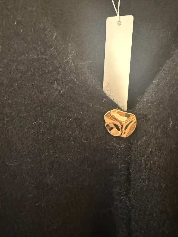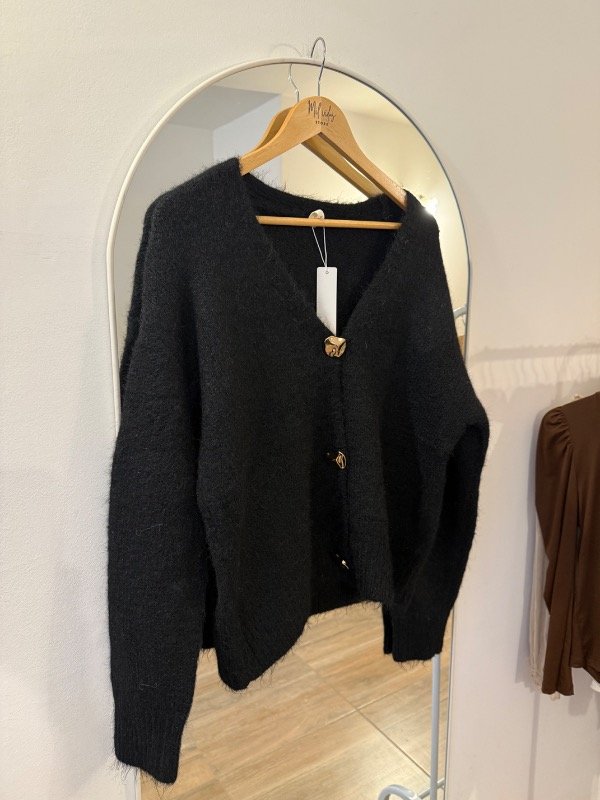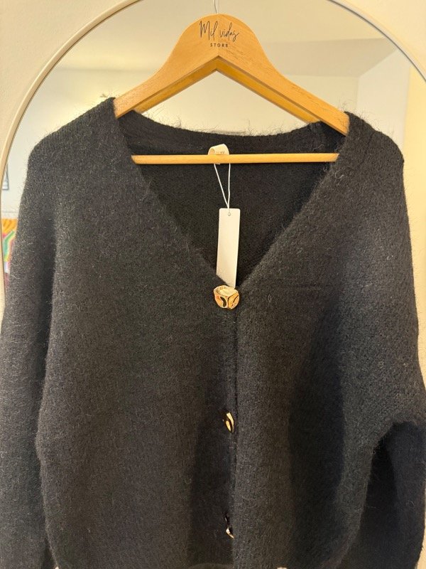 Saco largo tejido en lana de textura suave, con escote en V que estiliza la silueta. Presenta botones dorados al frente que aportan un detalle elegante y distintivo. Una prenda cómoda y abrigada, ideal para sumar calidez y presencia a cualquier look.