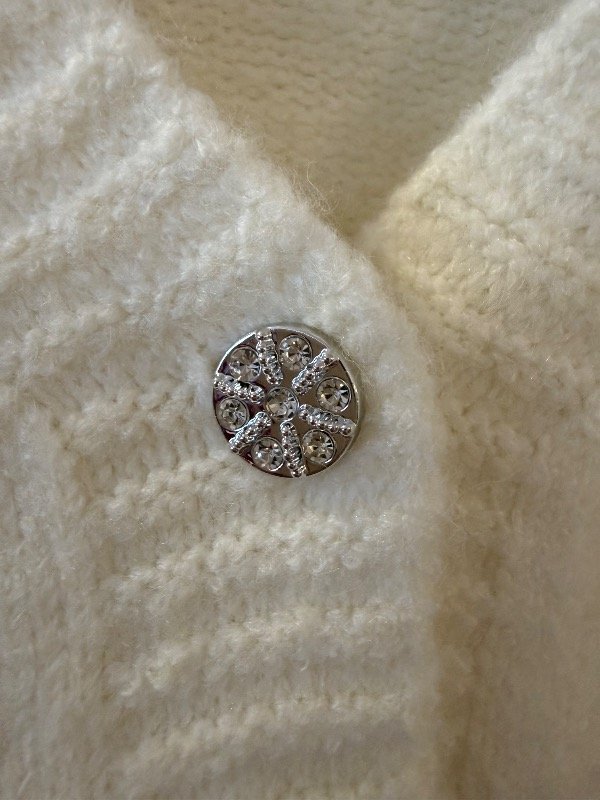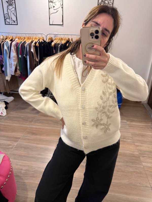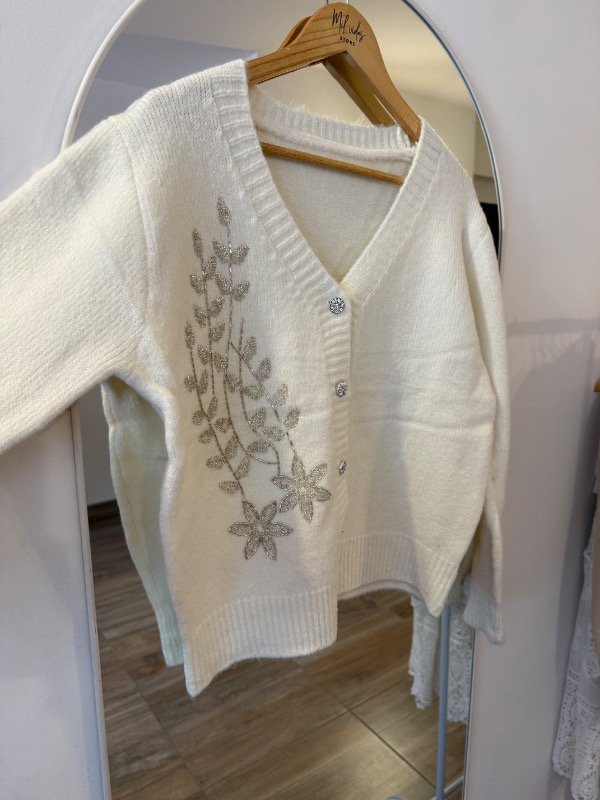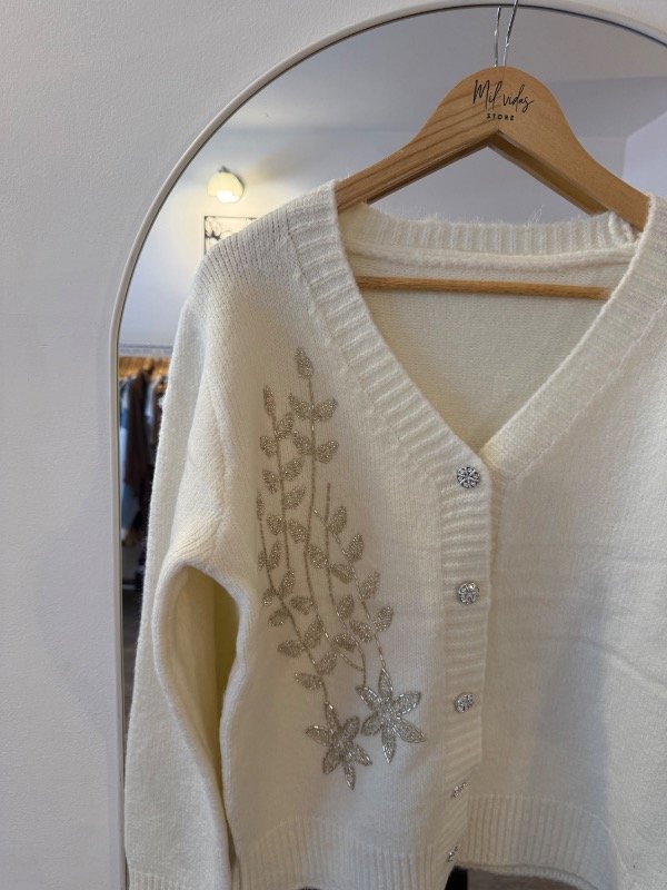 Cárdigan tejido de textura suave y abrigada, con escote en V y calce relajado. Presenta botones al frente con strass y un delicado bordado floral en uno de los laterales que suma un detalle sutil y especial. Su largo es ideal para usar tanto cerrado como abierto, adaptándose a distintos looks.