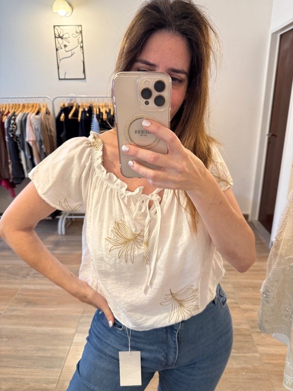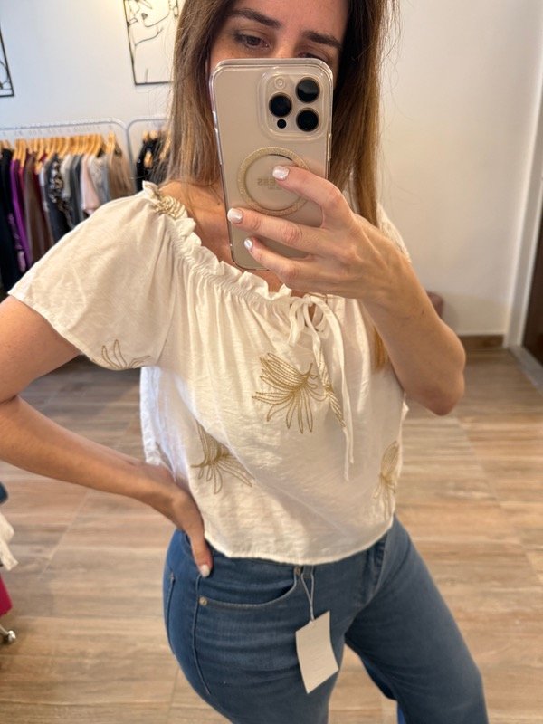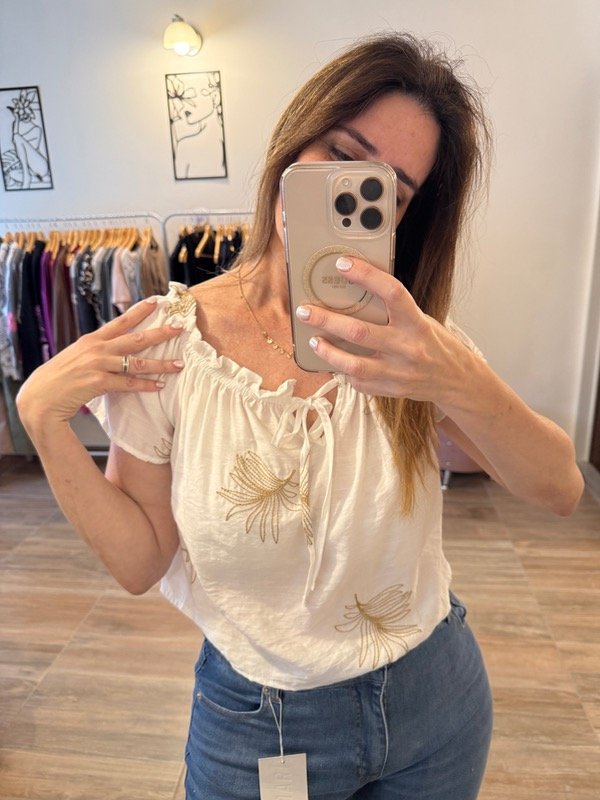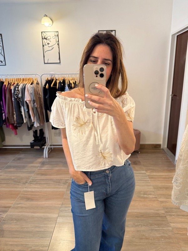Confeccionada en un tejido liviano y suave, aporta caída natural y comodidad durante todo el día. Su diseño presenta bordados amarronados estilo floral, que suman un toque artesanal y delicado.