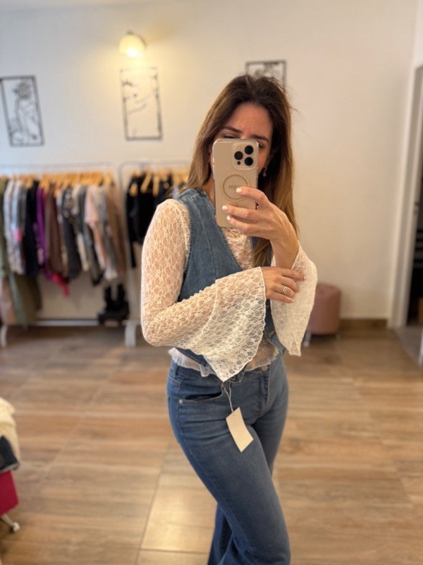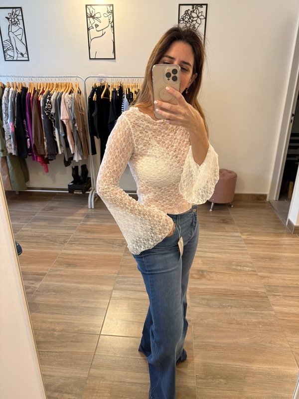Delicada, femenina y súper versátil. La Blusa está confeccionada en encaje suave y elastizado, con un diseño que realza cualquier look. Su protagonista absoluto: las mangas amplias con volado, que aportan movimiento y un toque romántico único.