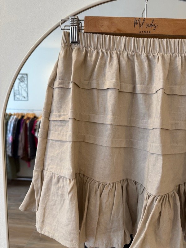 Confeccionada en suave lino, cuenta con un elástico en la cintura que se adapta perfectamente a tu silueta. Su diseño incluye volados divinos que le dan movimiento y un toque súper femenino.