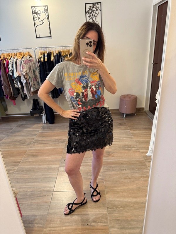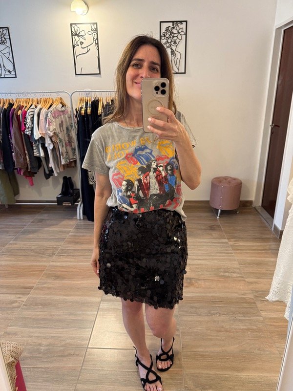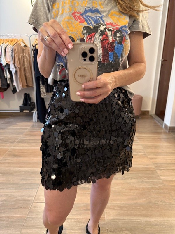 La falda Zoe es puro impacto. Confeccionada en lentejuelas negras con discos brillantes que aportan movimiento y luz, es ideal para esos momentos en los que querés destacar sin esfuerzo. Su diseño corto estiliza la silueta y eleva cualquier look, incluso combinada con prendas simples, como una remera o blusa.