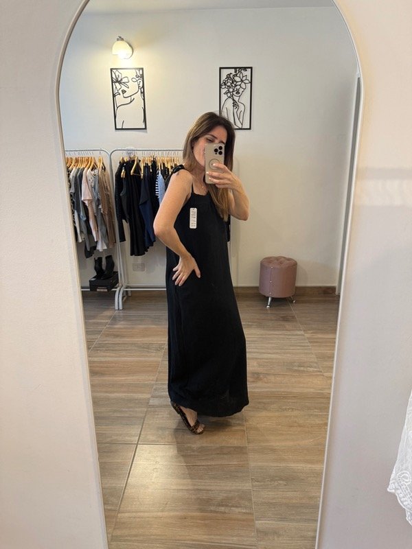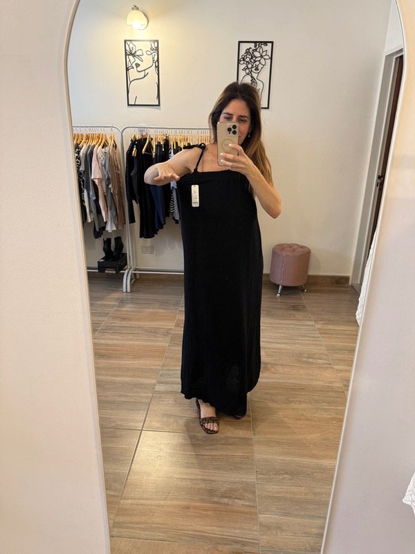 Un clásico que nunca falla. Nuestro solero largo negro está confeccionado en un tejido liviano con caída fluida que estiliza y acompaña cada movimiento. Posee breteles ajustables, escote delicado y espalda despejada para un look femenino y versátil. Ideal para llevar de día con sandalias o de noche con accesorios más elevados. Cómodo, fresco y súper combinable: un infaltable en tu guardarropa.