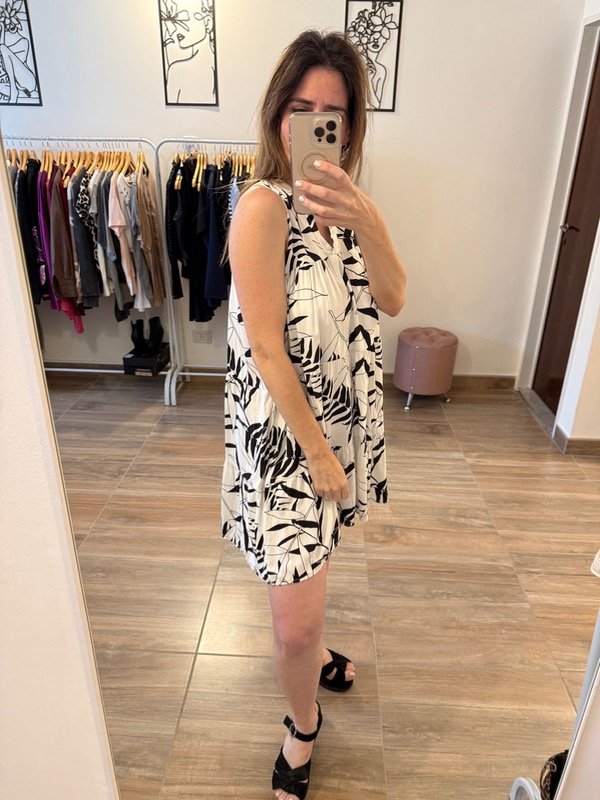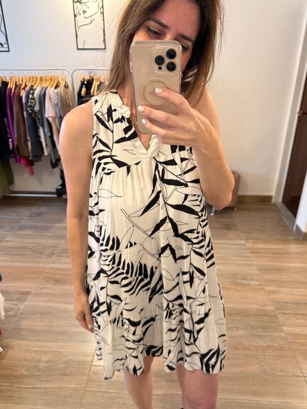 El Luz es ese vestido fresco y liviano que te resuelve el look en un segundo. Su estampado de hojas en blanco y negro le da un toque moderno sin perder delicadeza.