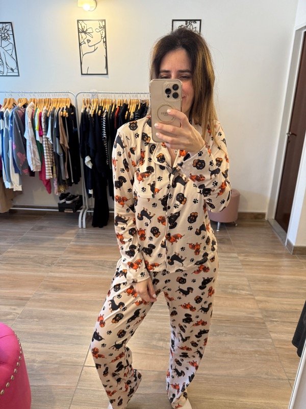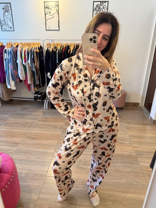 La camisa es de manga larga, con cuello clásico tipo camisero, botones frontales y bolsillo en el pecho. El pantalón presenta calce relajado, cintura con elástico y caída recta, adaptándose al cuerpo sin ajustar.