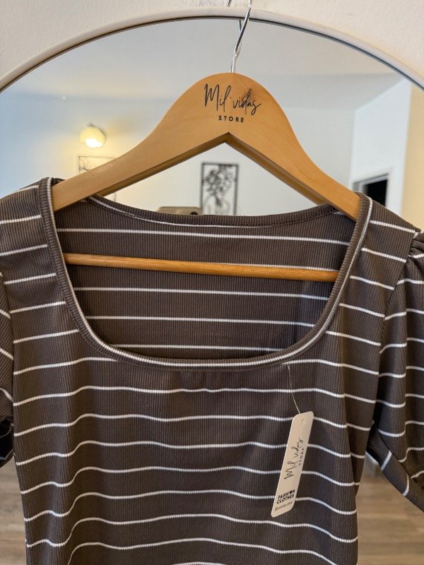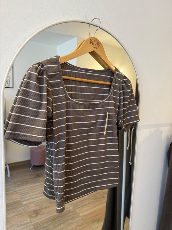 Remera manga corta de excelente de calidad de Morley y mangas princesa rayada choco y blanco.