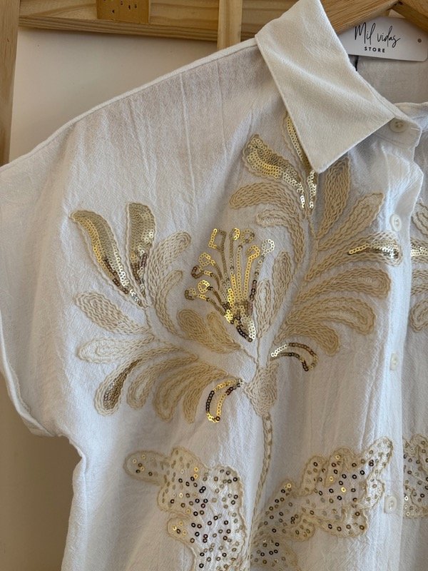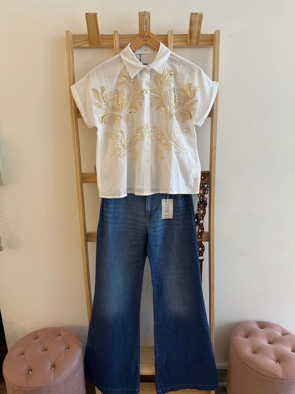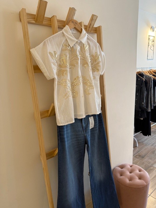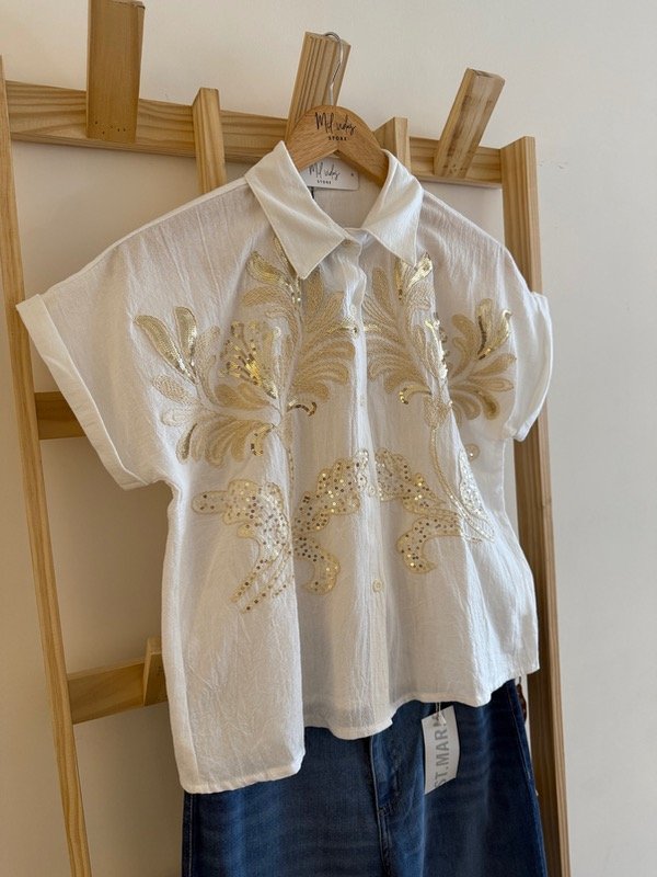 Elegante, fresca y con ese toque especial que hace la diferencia. La blusa Belisaria está confeccionada en válvula de algodón liviana, con bordados dorados y detalles de lentejuelas que iluminan cualquier look, ideal para usar con jeans, pantalones amplios o faldas.