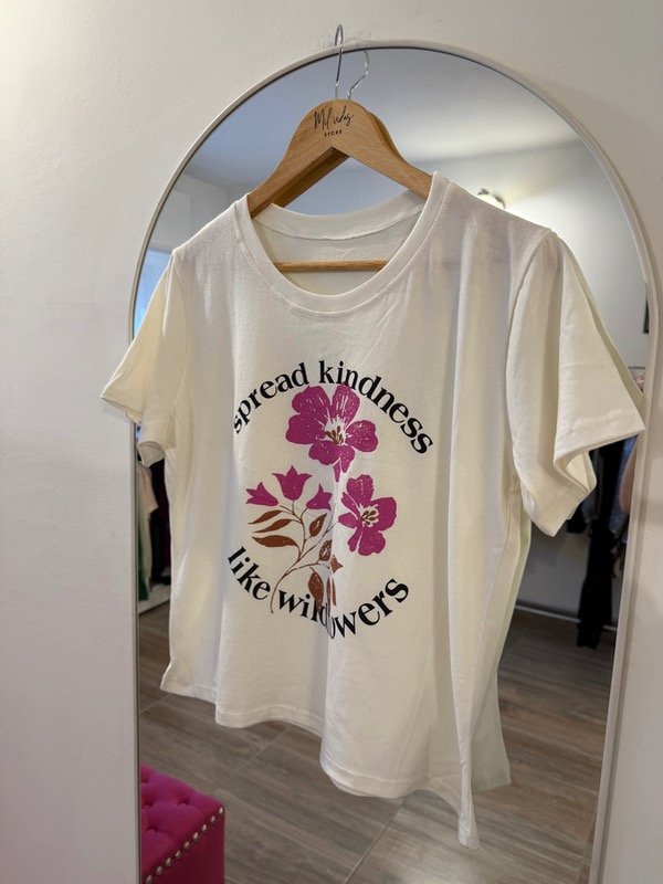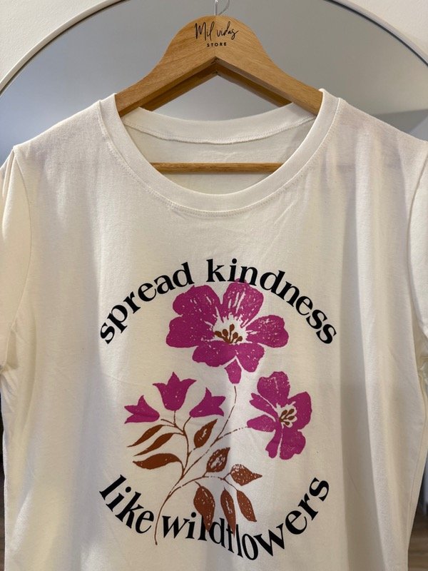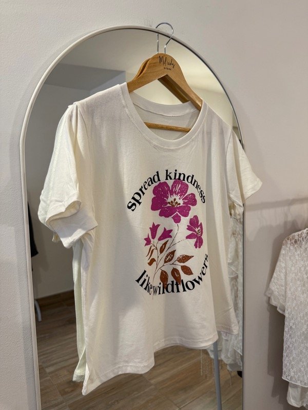 Remera de base natural con estampado de flores fucsias, ideal para sumar color y frescura a tus looks de todos los días. Su textura suave y liviana la hace perfecta para usar con jeans, shorts o faldas. Un diseño femenino y alegre que combina el encanto del print floral con la comodidad que buscás.